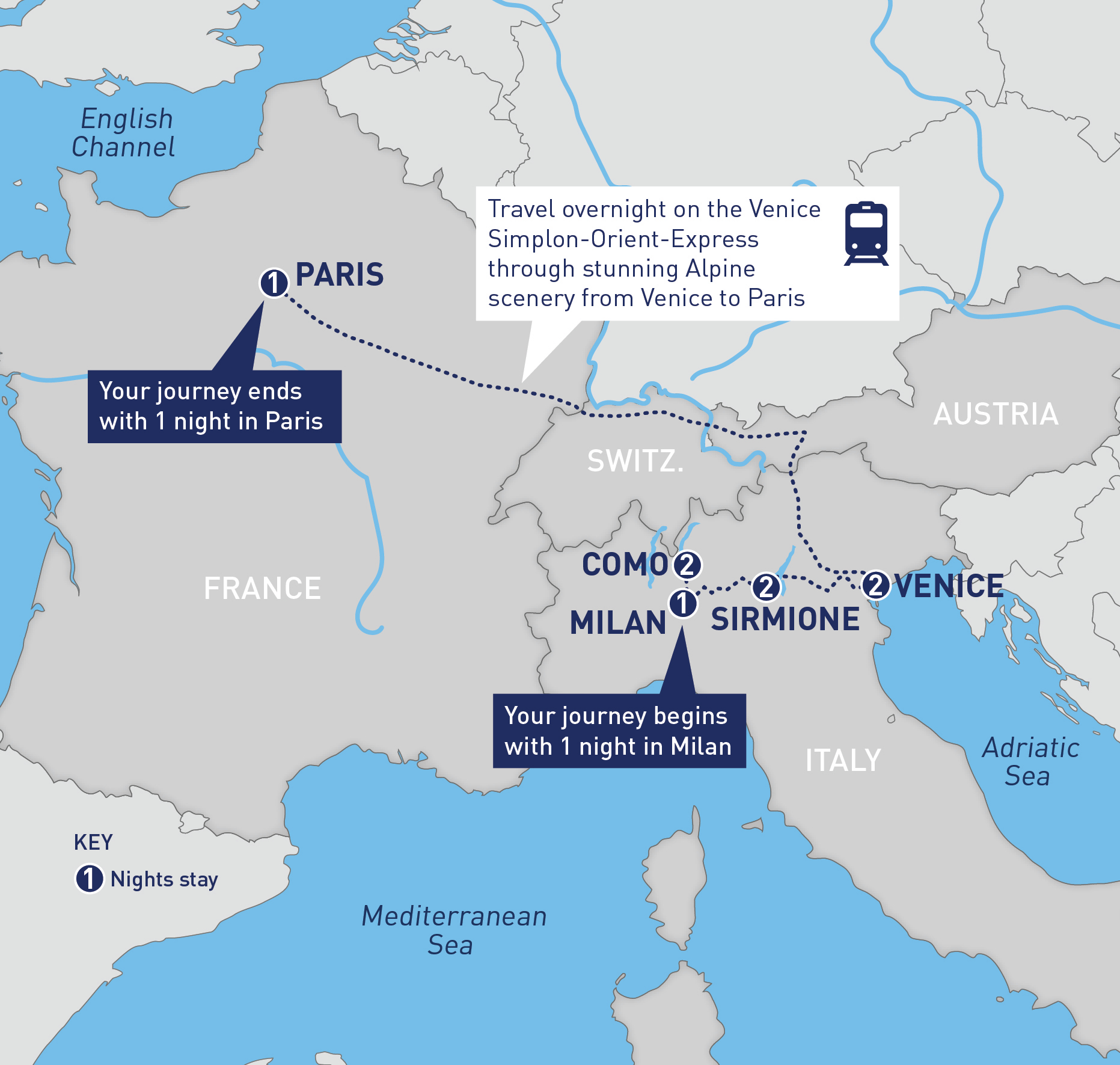 10 Days, 2 countries and 5 destinations by one of the most luxurious trains: the Venice Simplon-Orient-Express. Your journey begins in Milan Italy and concludes in Paris France.